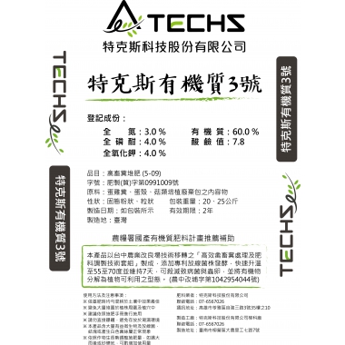 全氮:3% 全磷酐:4% 全氧化鉀:4% 有機質:60% 酸鹼值:7.8 肥製(質)字第0991009號